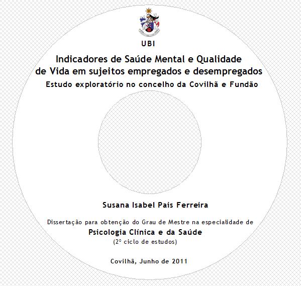 O presente estudo visou estudar e analisar indicadores de saúde mental e qualidade de vida em 222 sujeitos pertencentes ao concelho da Covilhã e Fundão da população activa e desempregada, do sexo feminino (n=153) e do sexo masculino (n=69), com idades compreendidas entre os 25 e 45 anos, de diferentes níveis educacionais. Para o efeito, foram utilizados dois questionários sócio-demográficos (um para a população empregada e outro para a população desempregada), o SCL-90-R (Questionário de avaliação de 90 sintomas) e um questionário de Qualidade de Vida (World Health Organization Quality Of Life – WHOQOL-Bref).